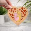 Celebrate a new baby or show your love and appreciation for a special mother with this bespoke wooden decoration made in our family home studio. The love heart design features a central mother and baby surrounded by hearts. This heart is filled with colourful resin that contains mica powder which glistens and sparkles, especially under artificial indoor lights. The resin is opaque, so this version is best suited to hanging on a wall or display on a mantlepiece or shelf, for example.
