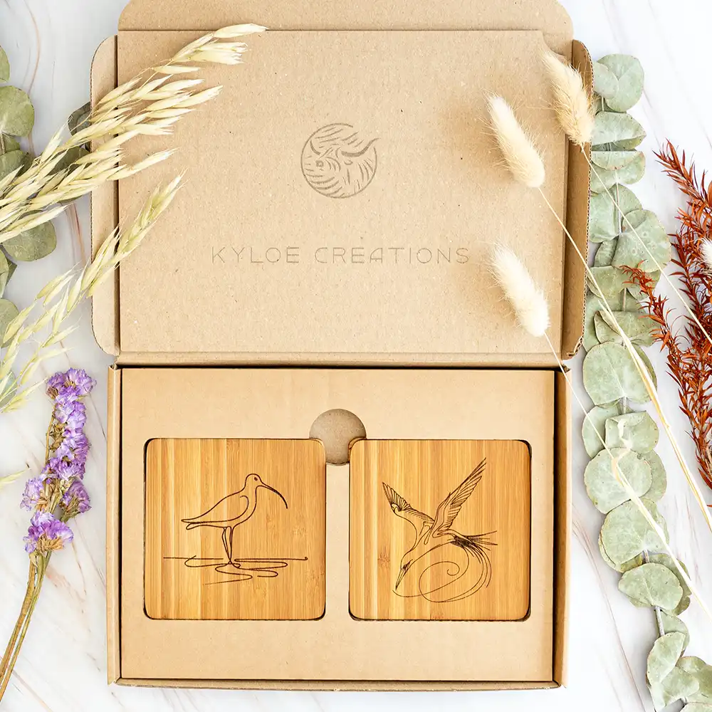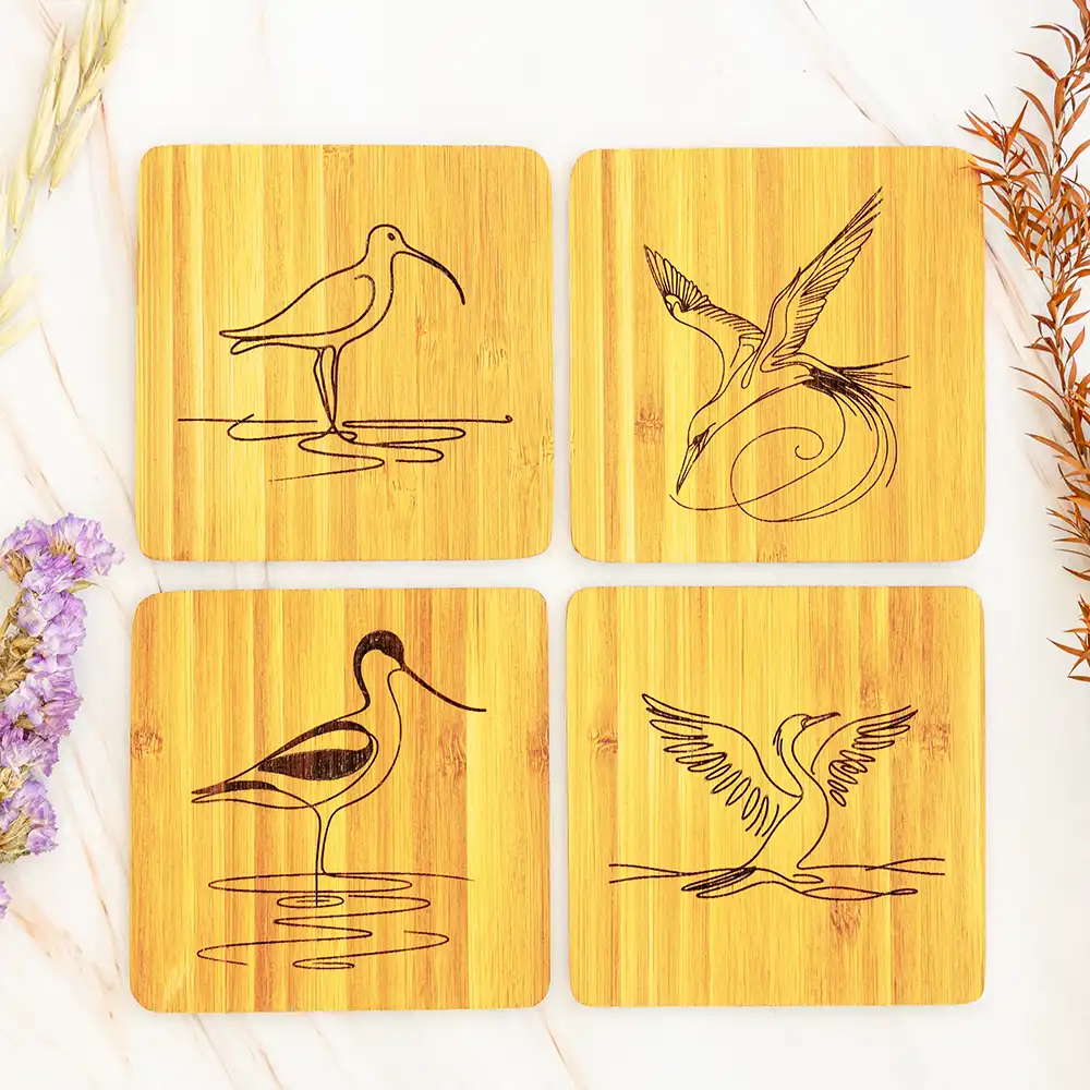 Get something for the nature lover in your life with these unique bamboo coasters. This set of British sea birds coasters includes four designs that include a diving gannet, a cormorant, a curlew and an avocet. These four coasters are a generous 9.5 cm wide – suitable for big tea/coffee mugs or beer/spirit/wine glasses. The designs are laser engraved to a considerable depth, which is very tactile in the hand. They are very impressive in person and very different from everyday mass produced printed products. Support our small family business and buy something special!