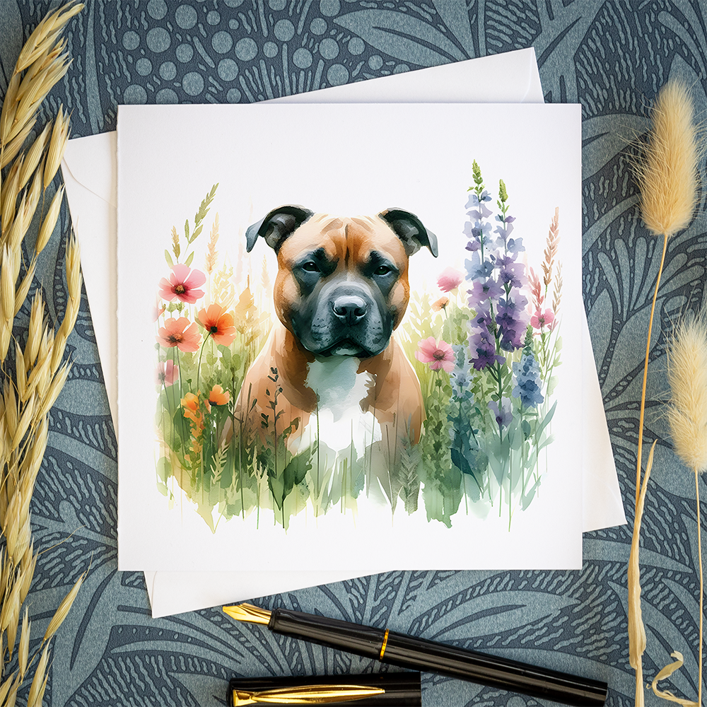 This set of four large Staffordshire bull terrier cards feature beautiful watercolours of Staffordshire bull terriers in wildflower meadows. These designs are unique to Kyloe Creations and you will not find them on the high street. The cards are blank inside and are large enough to write a long note. The cards are made from high quality 250 gsm matt white cardstock. We include white envelopes and tracked postage in the UK in the price shown.